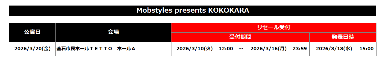 Mobstyles presents KOKOKARA(3.20 @岩手・釜石市民ホール TETTO ホールA)チケットリセール受付決定!