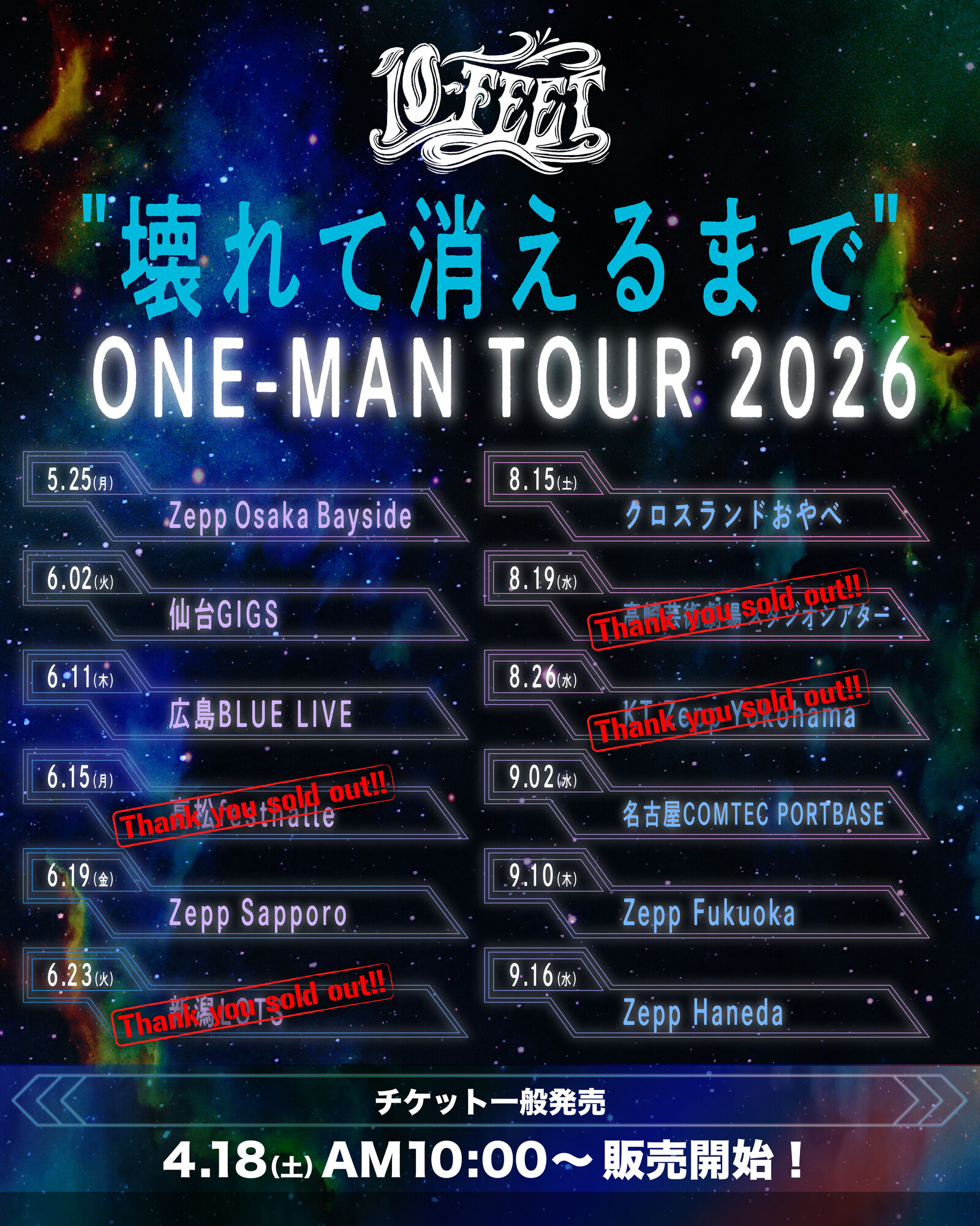 「10-FEET "壊れて消えるまで" ONE-MAN TOUR 2026」4.18(土) AM10:00〜 チケット一般発売開始!